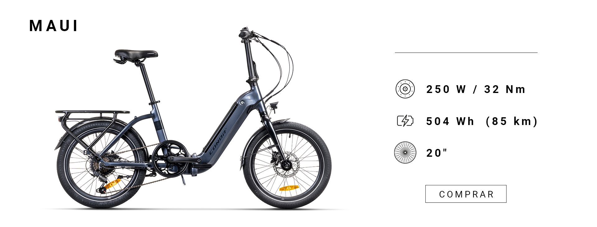 Modelo icónico MAUI es una bicicleta eléctrica plegable de ruedas de 20″ pensada para la movilidad urbana diaria y disponible en 2 colores.